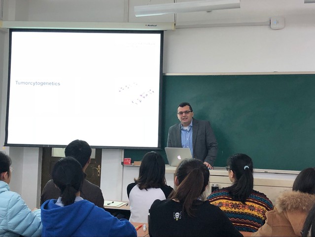 本次海外优质课程的教学内容由主管教学副院长贺文琦教授全程陪同。课程以Hugo教授的自我介绍拉开帷幕,他简述了自己的求学经历和科研方向。第一节课他以肿瘤生物学为主题,循序渐进,从染色体这个点切入逐渐扩展到科学研究常用的实验操作。在进行专业课的讲解时,他将自己的科研经历与专业知识相结合,以新的思维模式和讲授方式把知识传授给大家。虽然在专业英语的理解方面同学们还有一定的差距,但Hugo将晦涩的理论知识用浅显的语言表达了出来,语言幽默风趣,时不时就会与同学们互动交流,鼓励同学们表达想法,激烈的思想碰撞使同学们受益匪浅。