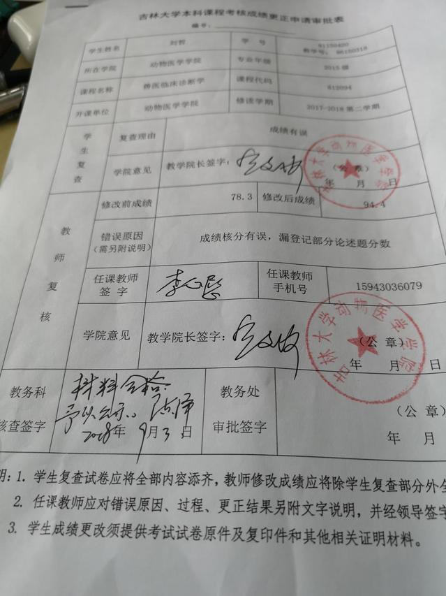 2015年级动物医学专业刘哲同学(学号:86150318)2017-2018-2学期兽医临床诊断学课程成绩更正如下: