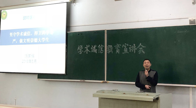 于2018年5月7日下午,在科学讲堂8100教室开展了以“坚守学术诚信,捍卫科学尊严,做文明崇德大学生”为题的学术诚信教育大会。本次教育大会由饶家辉副书记主讲,2013级全体毕业生参加。