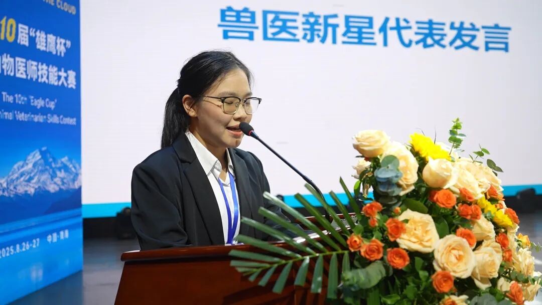 学子凭借扎实的专业基础、出色的实践能力与稳定的赛场发挥脱颖而出。由左思瑶、郭阳、齐琳、丁诗雨四名同学组成的参赛团队,历经多轮角逐始终保持领先优势,最终以全国第一的惊艳成绩斩获“大学生组”团体特等奖,创造了历史;张文龙、周晓菲、宋晓静三位老师荣获优秀辅导老师特等奖;团队成员左思瑶同学荣获中国兽医新星奖,并作为兽医新星代表发表讲话。