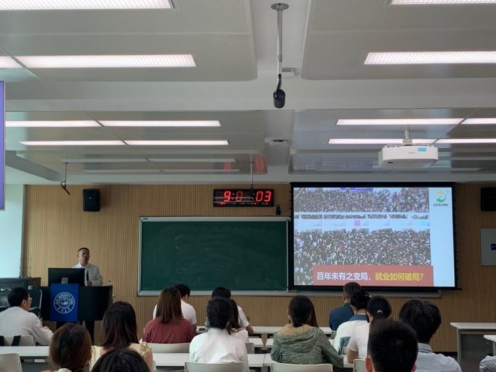 接下来,姜殿国副总经理通过讲解人生幸福模型、大学生职业生涯模型、职业发展三年一个阶段、“三业”认知模型,确定岗位就业等内容引导同学们对职业规划的系统性思考。同时以生泰尔集团事业板块为例,为同学们分析了动物保健品行业的就业岗位。