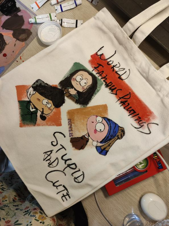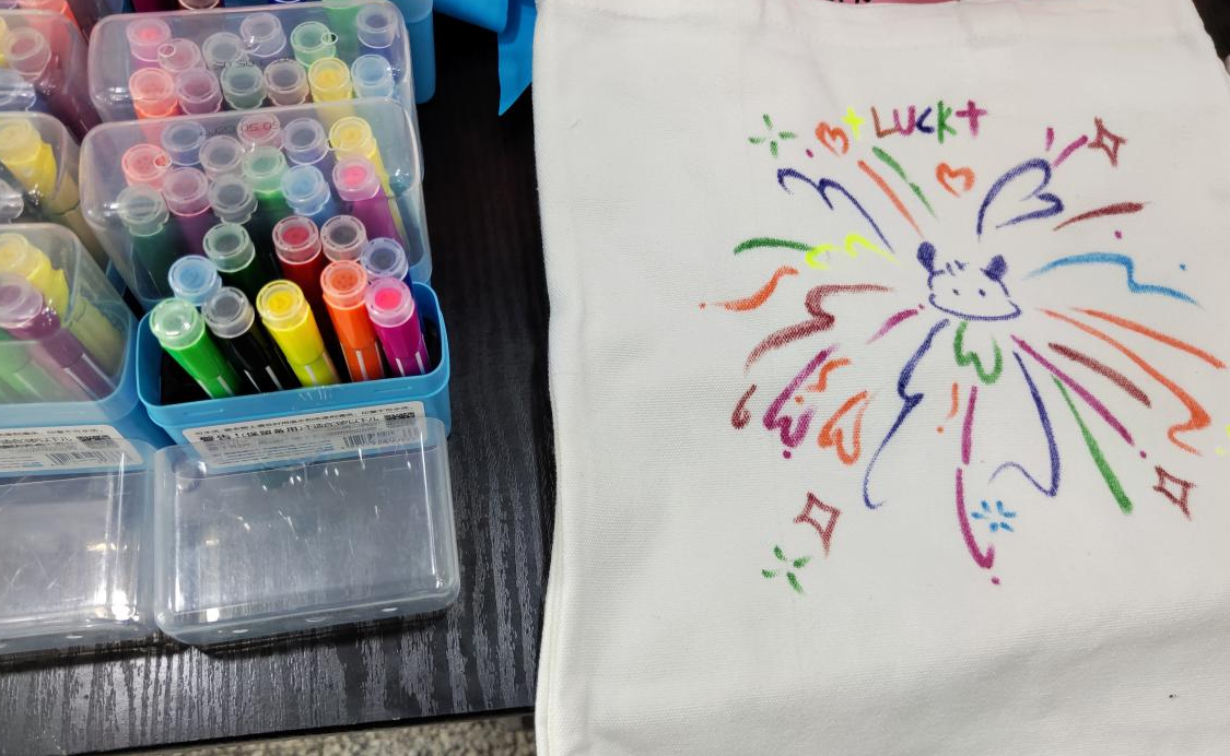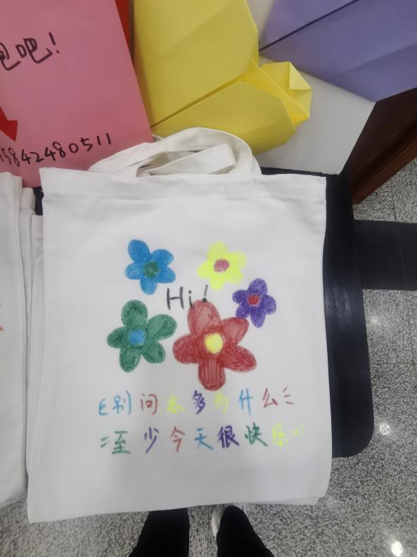 “以美润心,与心灵对‘画’”活动则给同学们带来了定制自己专属“限量版”帆布袋的机会。领取一个素色帆布袋,拿上颜料、画笔、调色盘,随意挥洒勾勒,点、线、面最终构成合乎心意的图案。内心的情感藉由色彩、线条和形状等元素倾诉表达,画完提笔再看,似乎烦扰已随笔墨宣泄,只留下独属自己的小包。借助涂鸦,从繁忙的学习工作中短暂抽身,更好地感受多彩的校园生活。