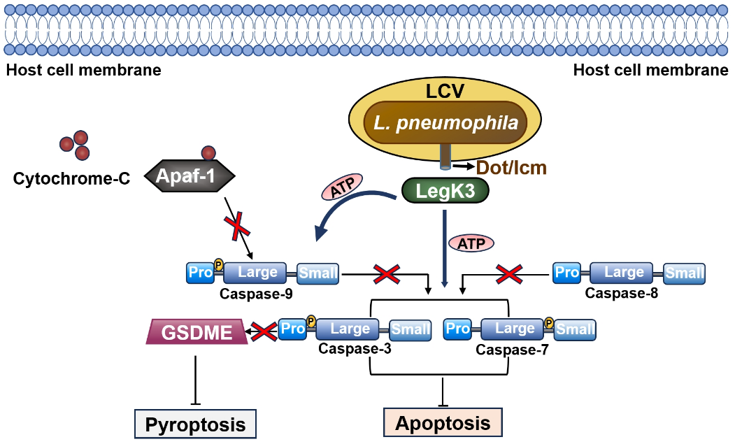 综上所述,该研究证实了嗜肺军团菌效应蛋白LegK3是已知的第一个通过磷酸化劫持胱天蛋白酶的细菌毒力因子。同时,该研究也系统的阐述了效应蛋白LegK3通过模拟真核细胞激酶功能,靶向多种胱天蛋白酶来扰乱宿主细胞程序性死亡途径的分子机制(图3)。这对进一步了解嗜肺军团菌致病机制具有重大意义,也为之后开发新型抗感染药物以及治疗相关疾病提供理论基础。