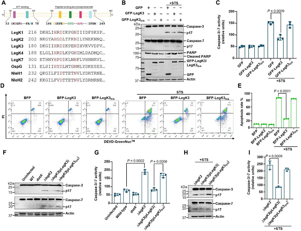 图1. LegK3抑制细胞凋亡且依赖其激酶活性