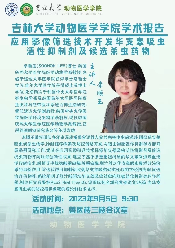 报告人 李顺玉(SOONOK LEE)博士,韩国 庆熙大学医学院医学动物学系教授 报告地点 兽医楼三楼会议室