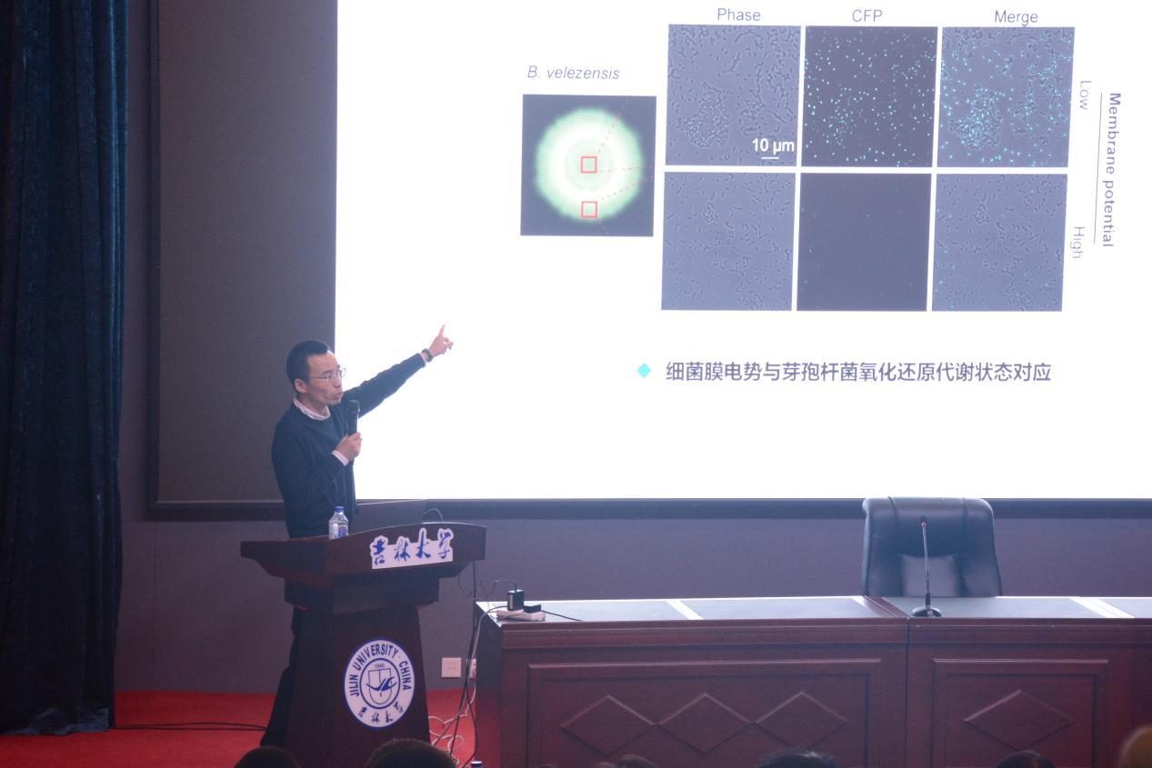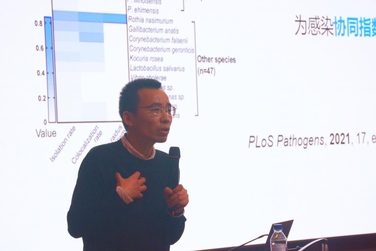 师生进行热烈交流,并回答了同学们提出的有关如何增强抗菌分子靶向性、降低对机体毒害作用等问题。他以抗麦角杆菌药物为例,可通过修改该药的分子结构达到减小机体损伤的目的,再次强调厘清细菌-宿主互作机制、优化抗菌分子的重要性。