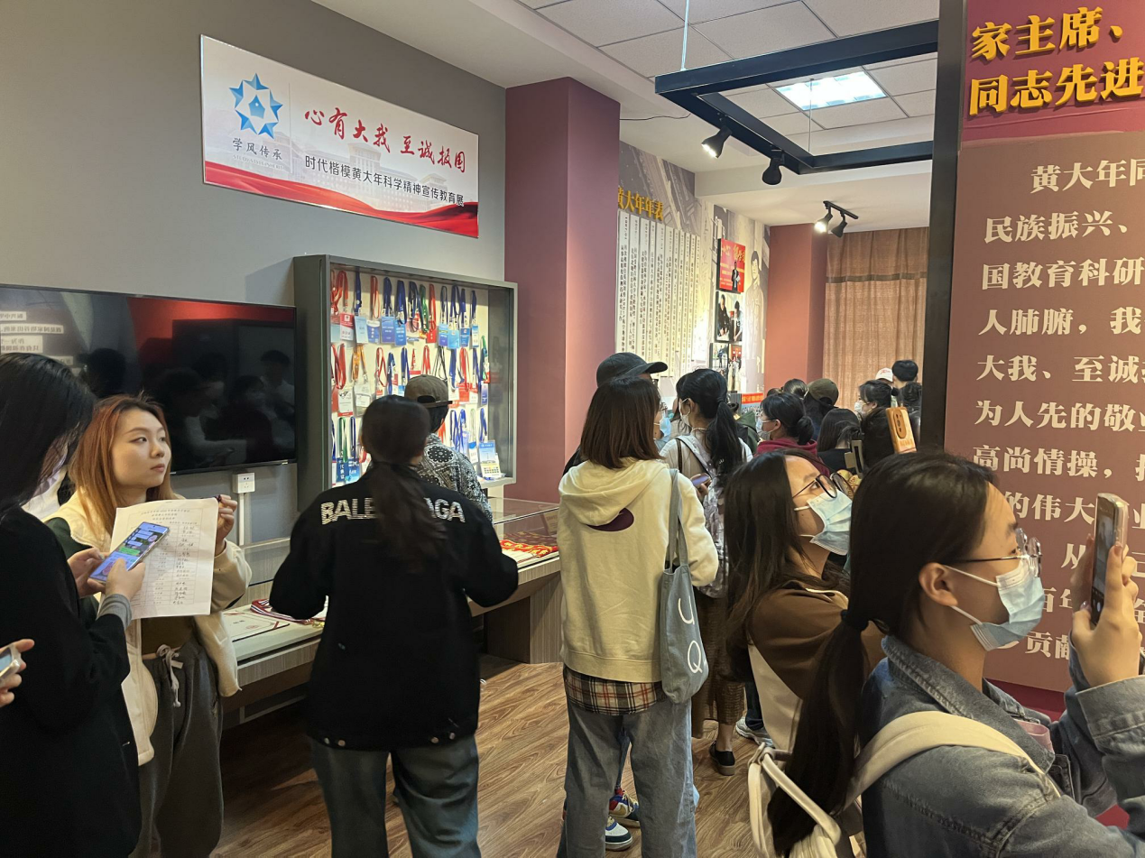 在讲解老师带领下,同学们参观了黄大年先生生前工作的办公室,对黄大年老师的一生以及先生生前用过的物品等内容进行了讲解。他在入党志愿书中写到的那句“若能做一朵小小的浪花奔腾,呼啸着加入献身者的滚滚洪流中,推动历史向前发展,才是一生中最值得骄傲和自豪的事情”,至今仍广为传颂,影响深远。一封封手稿,一张张图片,一件件史料,一部部影像,让黄大年同志生前的剪影栩栩如生。一一再现了黄大年从少年立志筑梦,青年求学追梦,学成归国圆梦各个时期的经历和事迹。让大家深切感受到黄大年同志的爱国情怀,教书育人、敢为人先的敬业精神,淡泊名利、甘于奉献的高尚情操。他用自己的一生,书写了“振兴中华,乃我辈之责”的九字箴言!