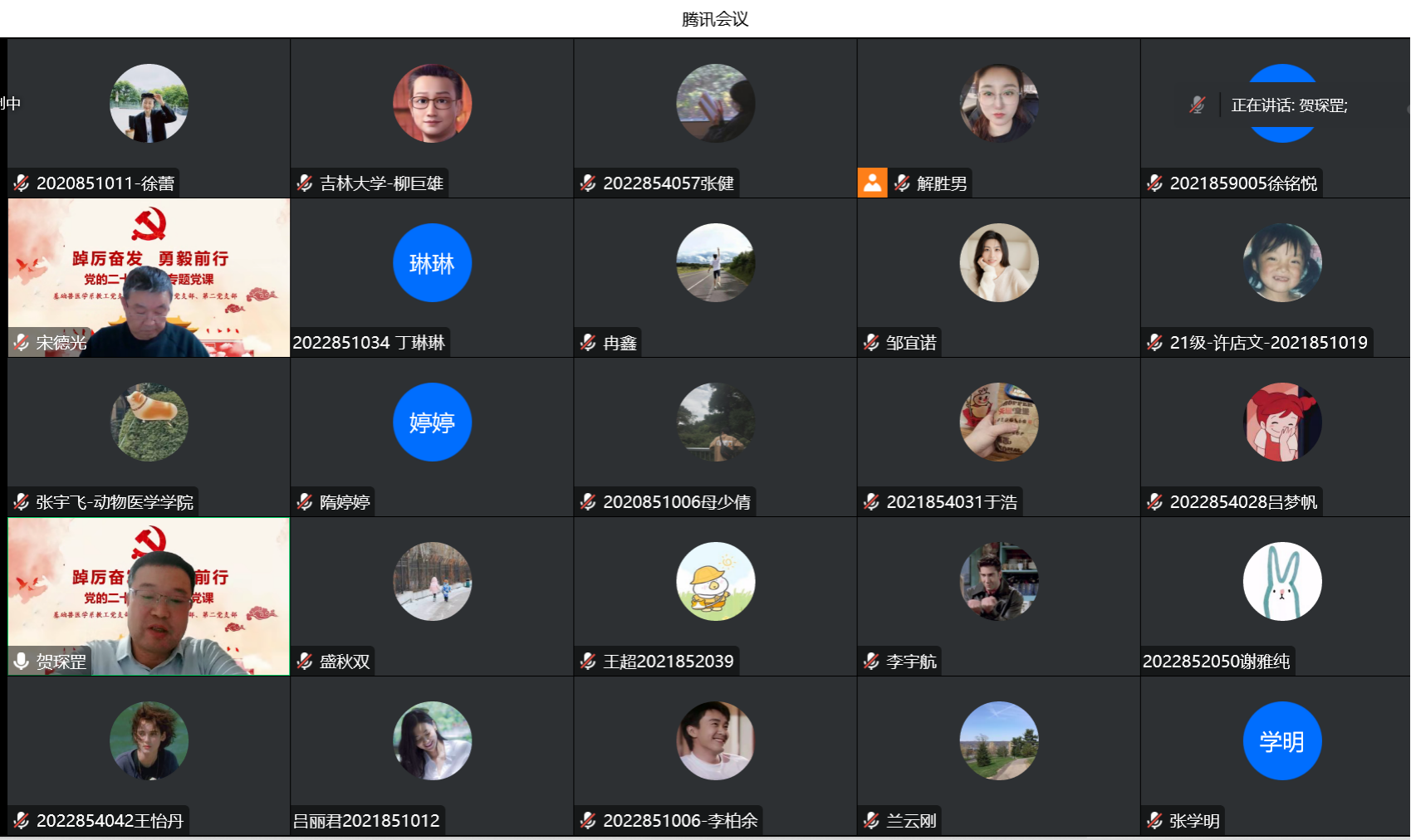 副院长贺文琦教授主讲党课。基础兽医学系教工党支部、研究生第一党支部、第二党支部全体党员及入党积极分子90余人参加线上活动。