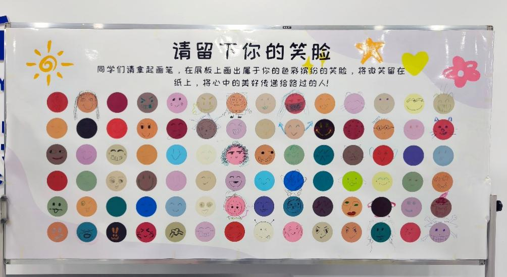在“留下笑脸”环节,路过的同学们纷纷用颜料在展板上留下自己的笑脸或想画的脸庞,以及鼓励他人的话语。微笑墙的设立传递了正能量,让更多人感受到微笑的力量,积极面对生活。