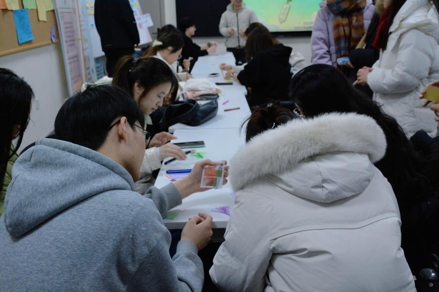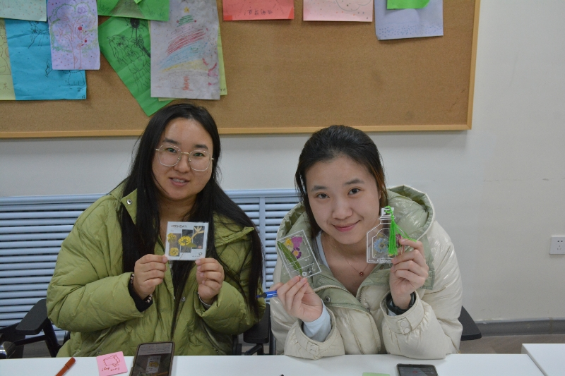 活动现场准备了干花、马克笔及书签等材料,同学们循着心意自由创作。他们用干花与马克笔勾勒巧思,让普通书签成为承载个性与创意的作品。现场氛围专注而融洽,一件件独具创新的作品在指尖成型,盛满了同学们当下创作的热情。随后,同学们互相分享作品并诉说创作时的想法及作品背后的故事。