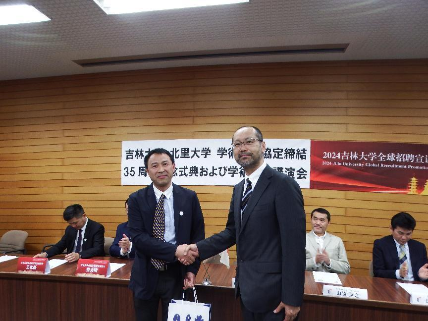 一行赴北里大学兽医学部参加两校交流三十五周年的庆祝仪式活动。学校人才工作办公室李叶副主任、学院党委书记饶家辉、副院长贺文琦、王化磊、外事秘书张敏婕,北里大学兽医学部学部长冈野昇三、学科长山胁英之、事务长漆畑勇氏、国际交流委员会委员长胡东良及师生40余人参加了此次庆祝仪式,仪式由北里大学田边太志教授主持。