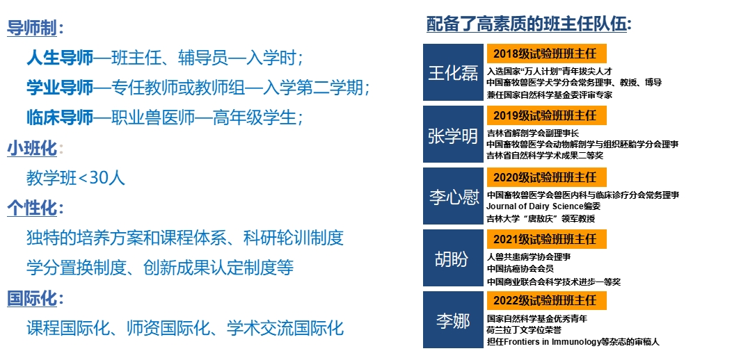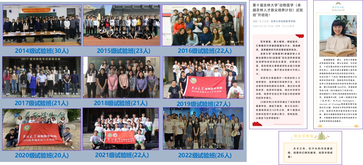 2014年试办卓越人才培养试验班,实行“一制三化”:导师制、小班化、个性化、国际化,现组建10期,累计237名学生,目前读研率为98%,出国交流率41%,科研参与率100%,发表SCI论文影响因子总数154.95,获国家级竞赛奖项59项。以2024届动物医学(卓越农林人才拔尖培养计划)试验班为例,班级27名学生,英语四六级通过率为100%,85%的同学被推免到清华、北大、中科院等双一流A类大学或科研院所,2人入选DVM项目,班级被评为“2023年拷贝漫画