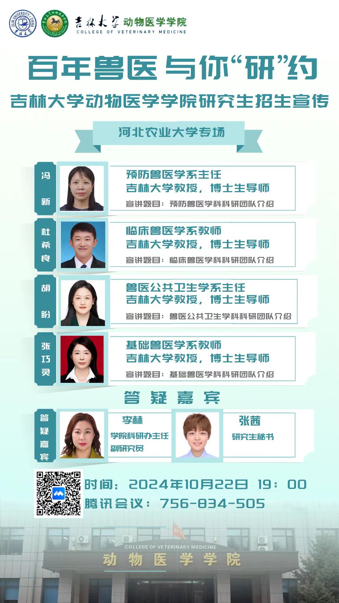在线上成功举办了2024年研究生招生宣传——河北农业大学专场活动。参加本次活动的有预防兽医学系主任冯新教授、兽医公共卫生学系主任胡盼教授、基础兽医学系张巧灵教授、临床兽医学系杜希良教授,以及研究生办主任李赫和研究生秘书张茜老师。