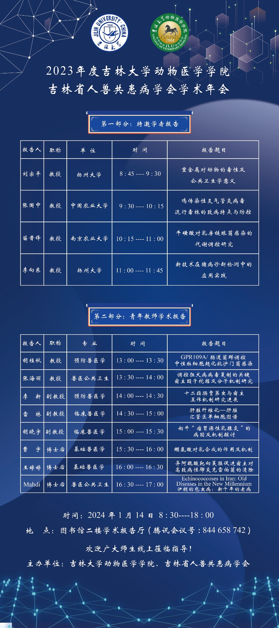 / 2024-01聚焦科研前沿,共话精彩未来。为活跃学术氛围,开拓科研视野,促进学科交叉交流,由拷贝漫画 、人畜共患传染病重症诊治全国重点实验室和吉林省人兽共患病学会共同主办的2023年度学术年会于2024年1月14日在和平校区图书馆二楼学术报告厅举行。来自中国农业大学、南京农业大学、扬州大学、拷贝漫画 等校内外的专家学者汇聚一堂,分享成果,交流经验,为全院师生带来了一场精彩纷呈的学术盛宴,吸引了校内外数百名师生的...